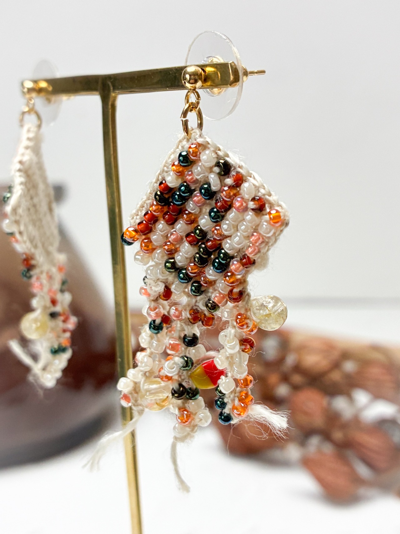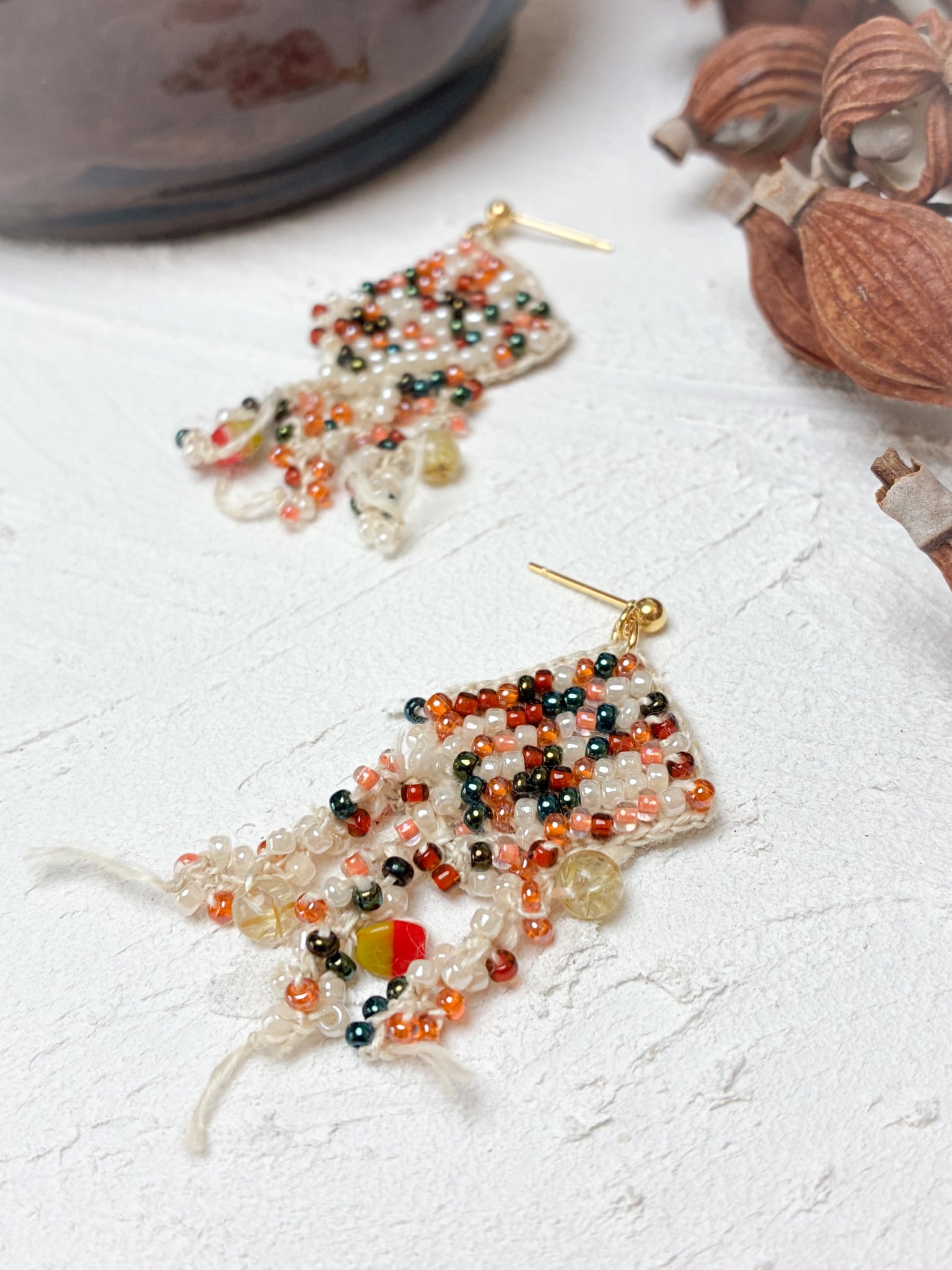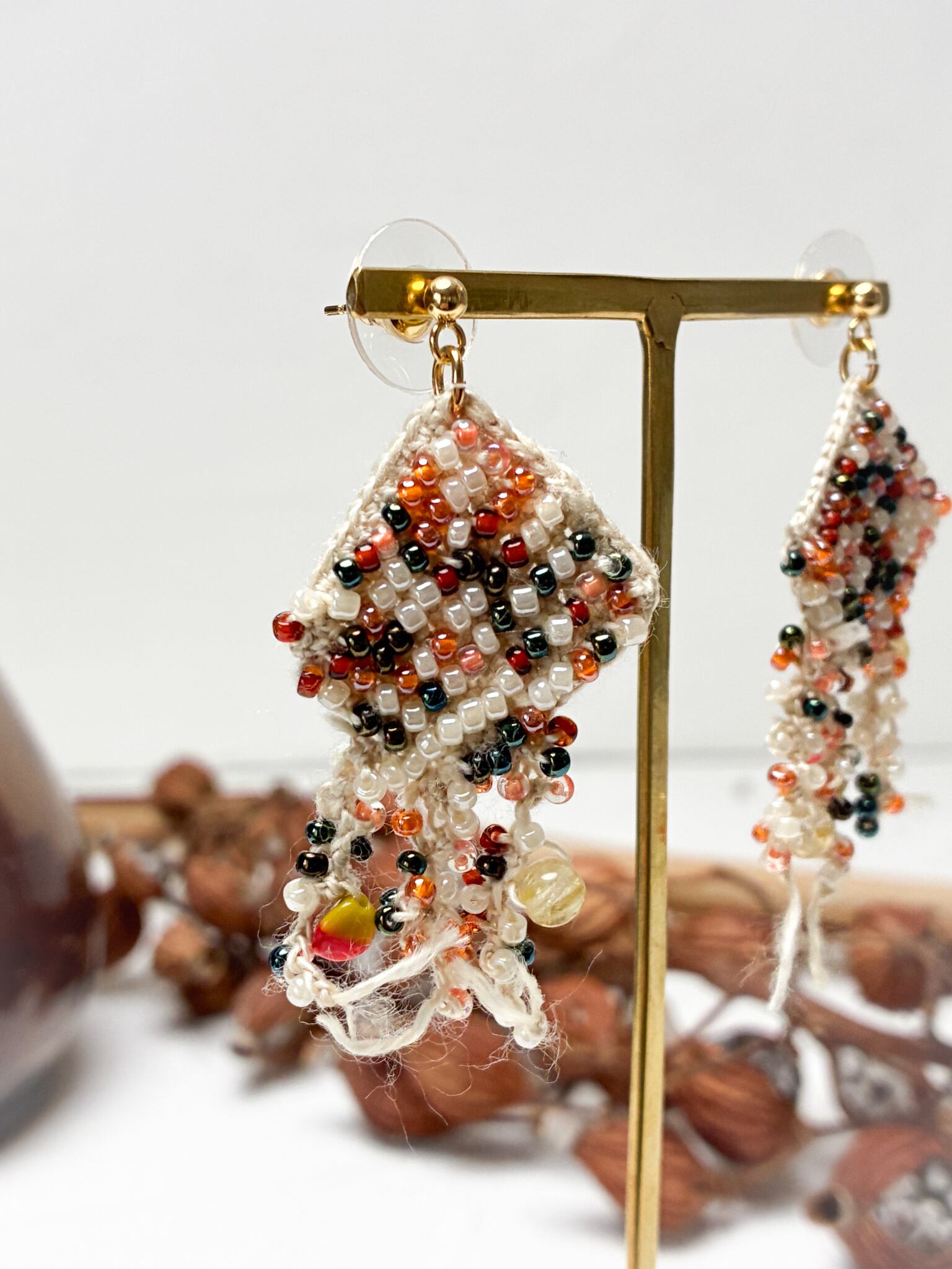 コーヒー染めの糸を使用し、オレンジ系のビーズを組み合わせて作られた耳飾りは