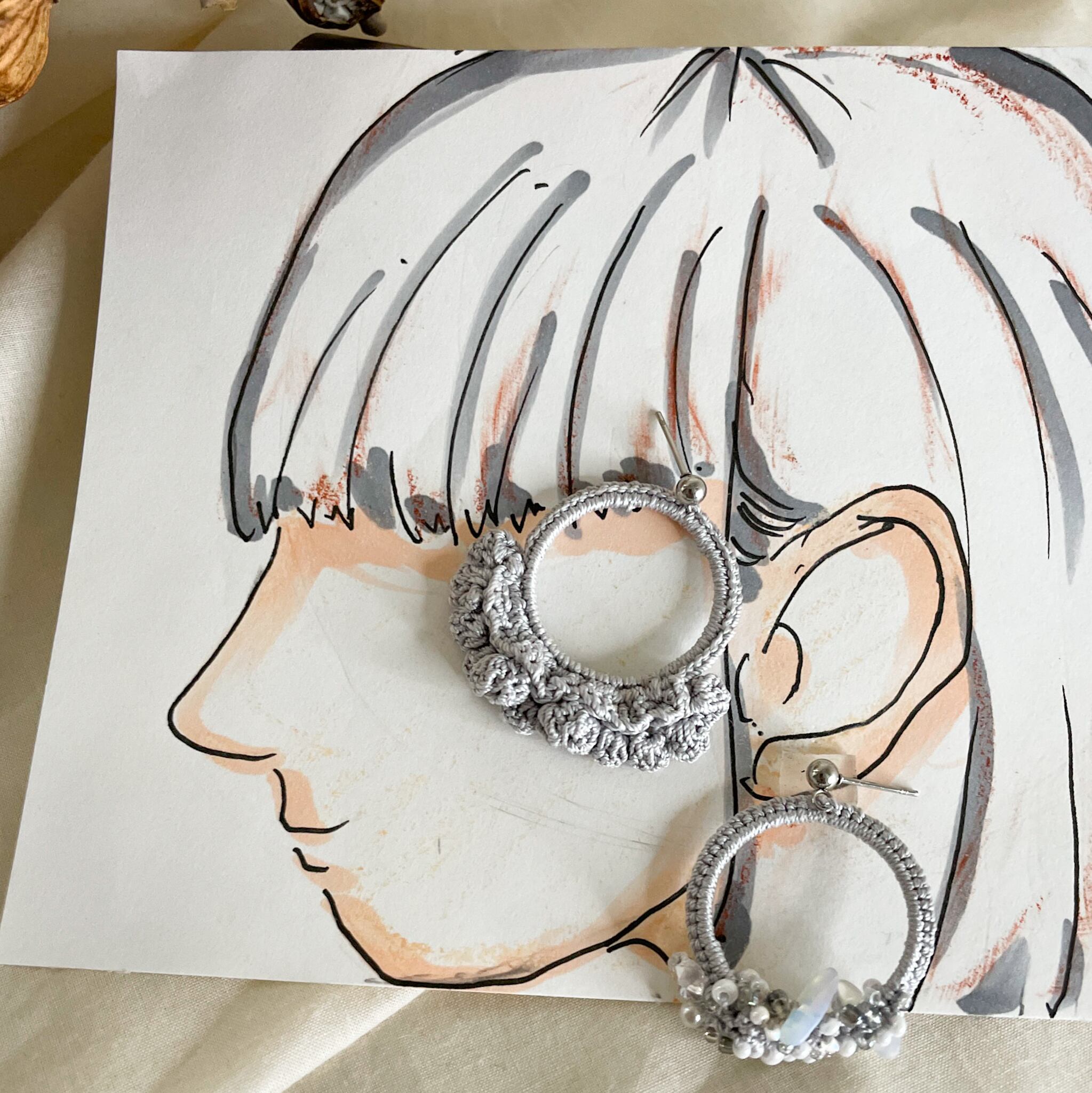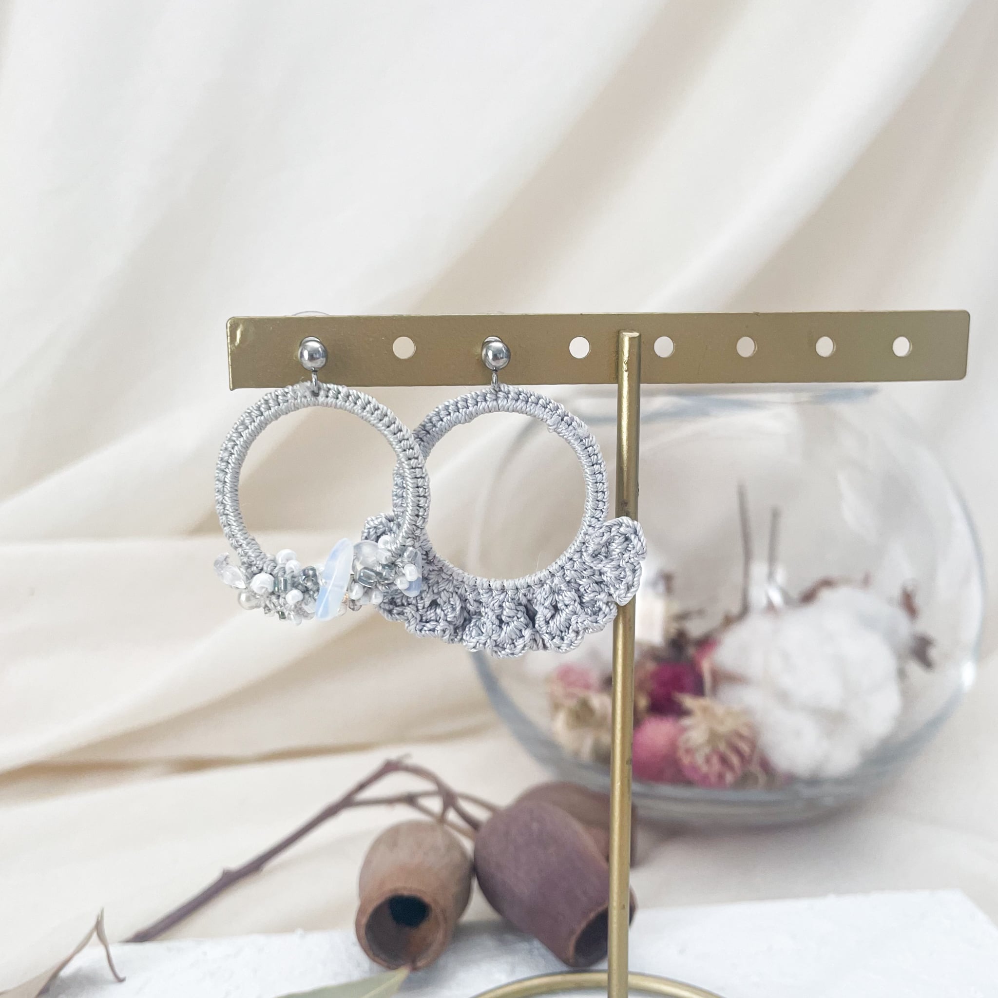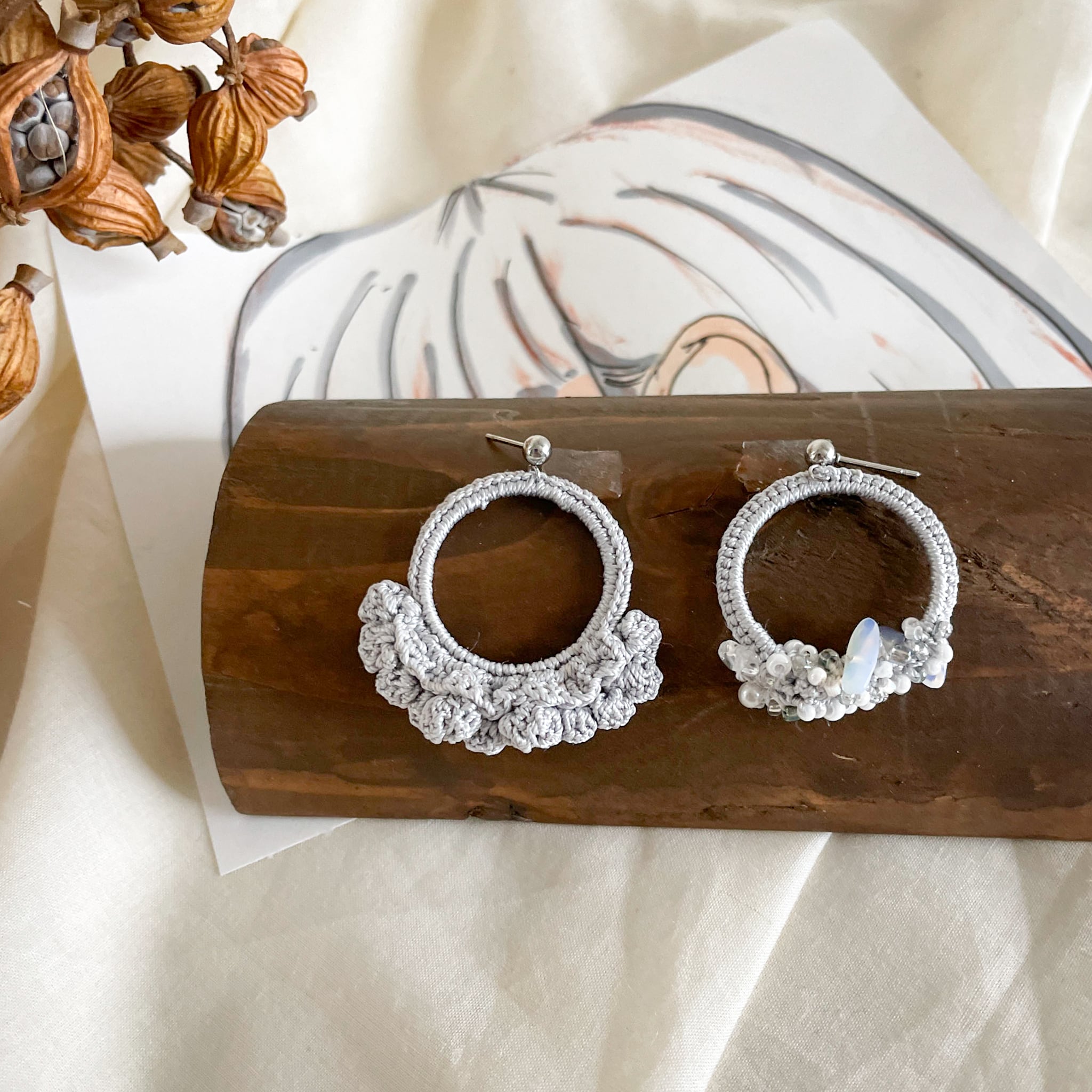 ハイイロノワッカはグレーの糸を使用していて、白やクリアのビーズ、花嫁さまにピッタリなパールや水晶やホワイトオパールの細石を丁寧に編み込みました。