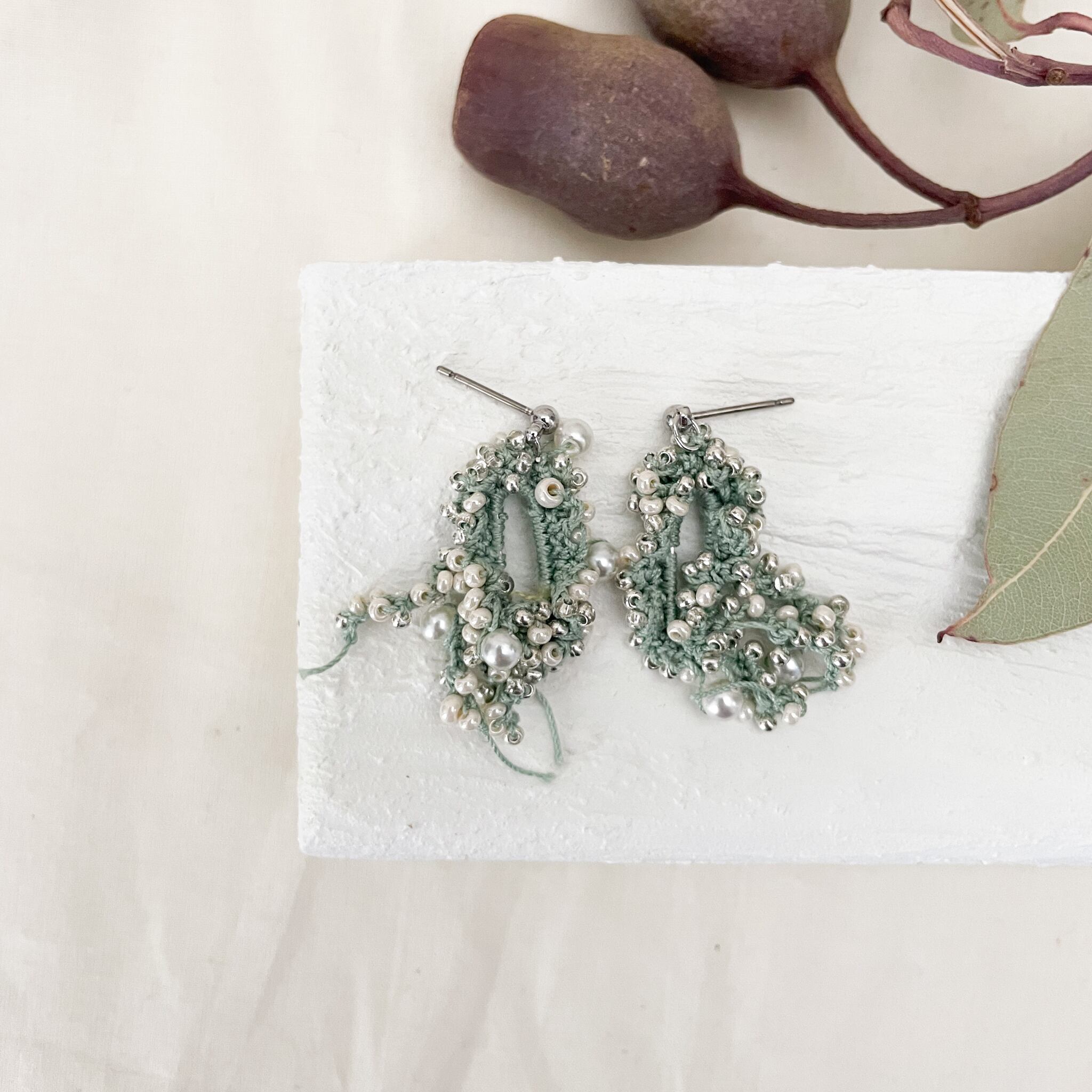 ミドリシロは緑色の糸を使用していて、白のビーズとニュアンスカラーの緑色がどんなコーディネートにも馴染みます。
