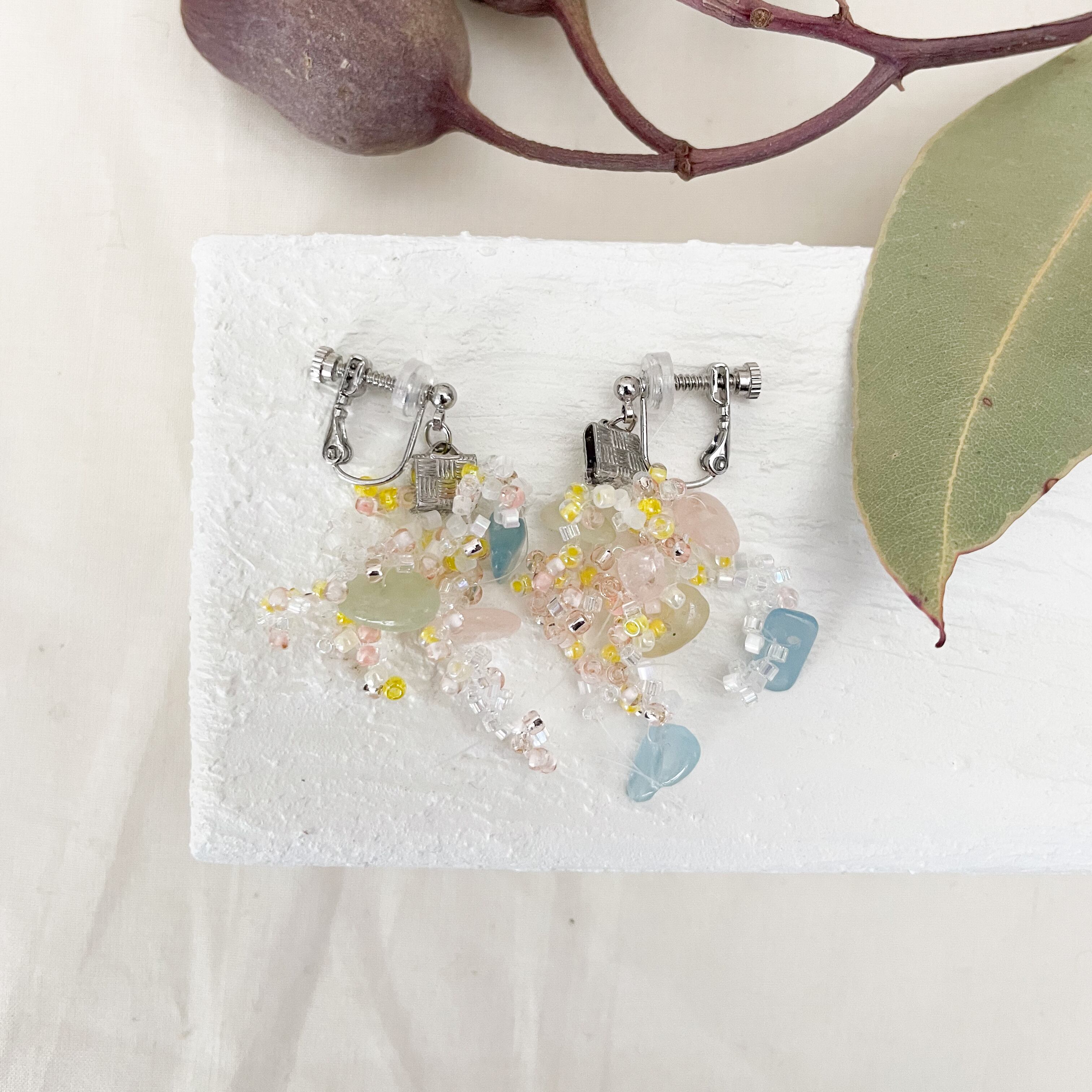 トウメイのはなびらは、いろんな天然石の細石をランダムに集めて、白やピンク、黄色のビーズと一緒に詰め込みました。