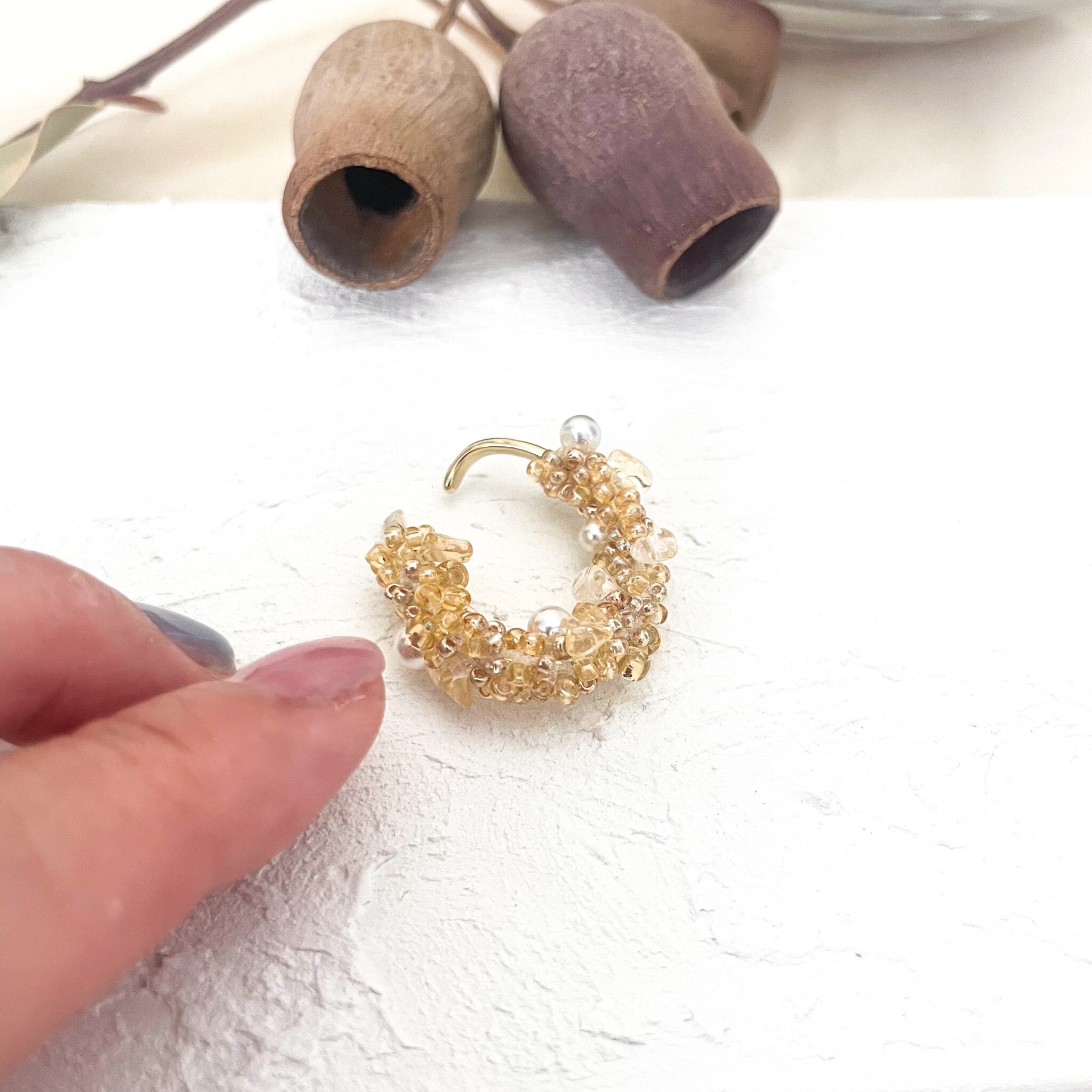 トウメイの太陽イロは、天然石のシトリンに合わせて、ベージュゴールドのビーズ、アクセントに樹脂パールをぎゅっと編み込んで仕立てました。