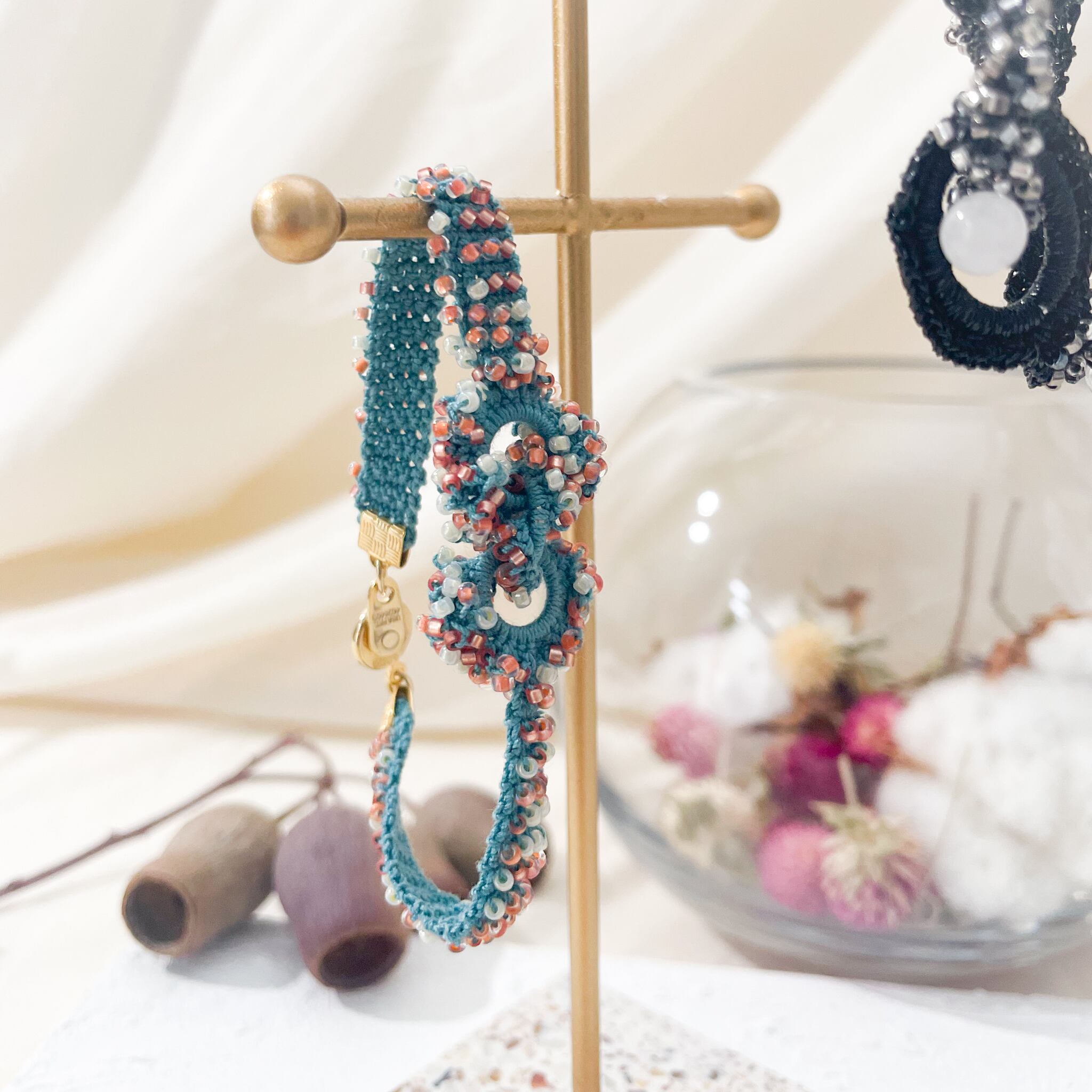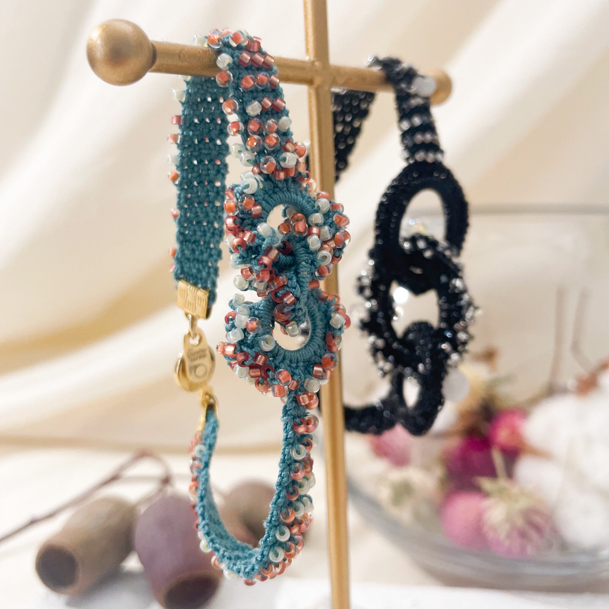 たくさんのイロのレース糸にたくさんのイロのビーズを一粒ずつ丁寧に編み込み仕立てます。