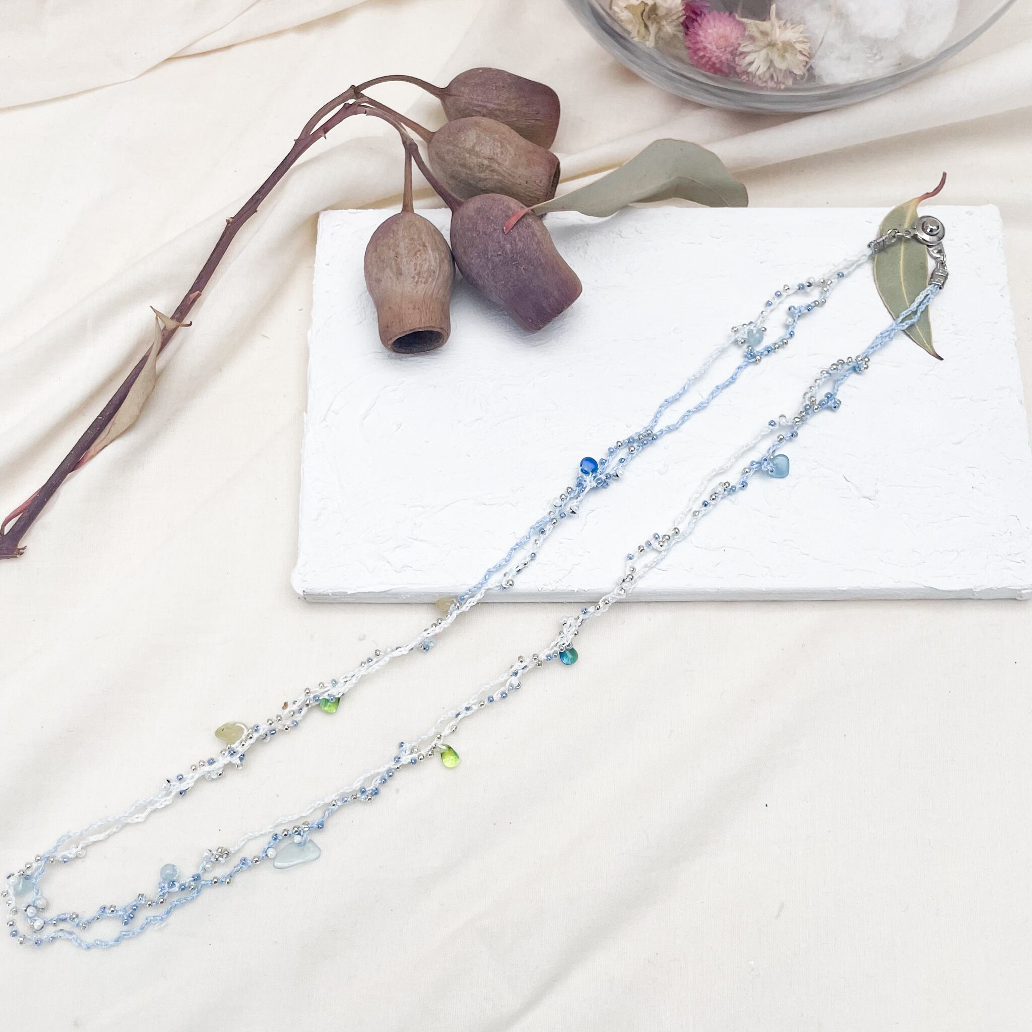 白と青のグラデーションの糸にシルバーや水色・クリアのビーズに、青や緑のドロップビーズや、アクアマリンの細石を編み込みました。