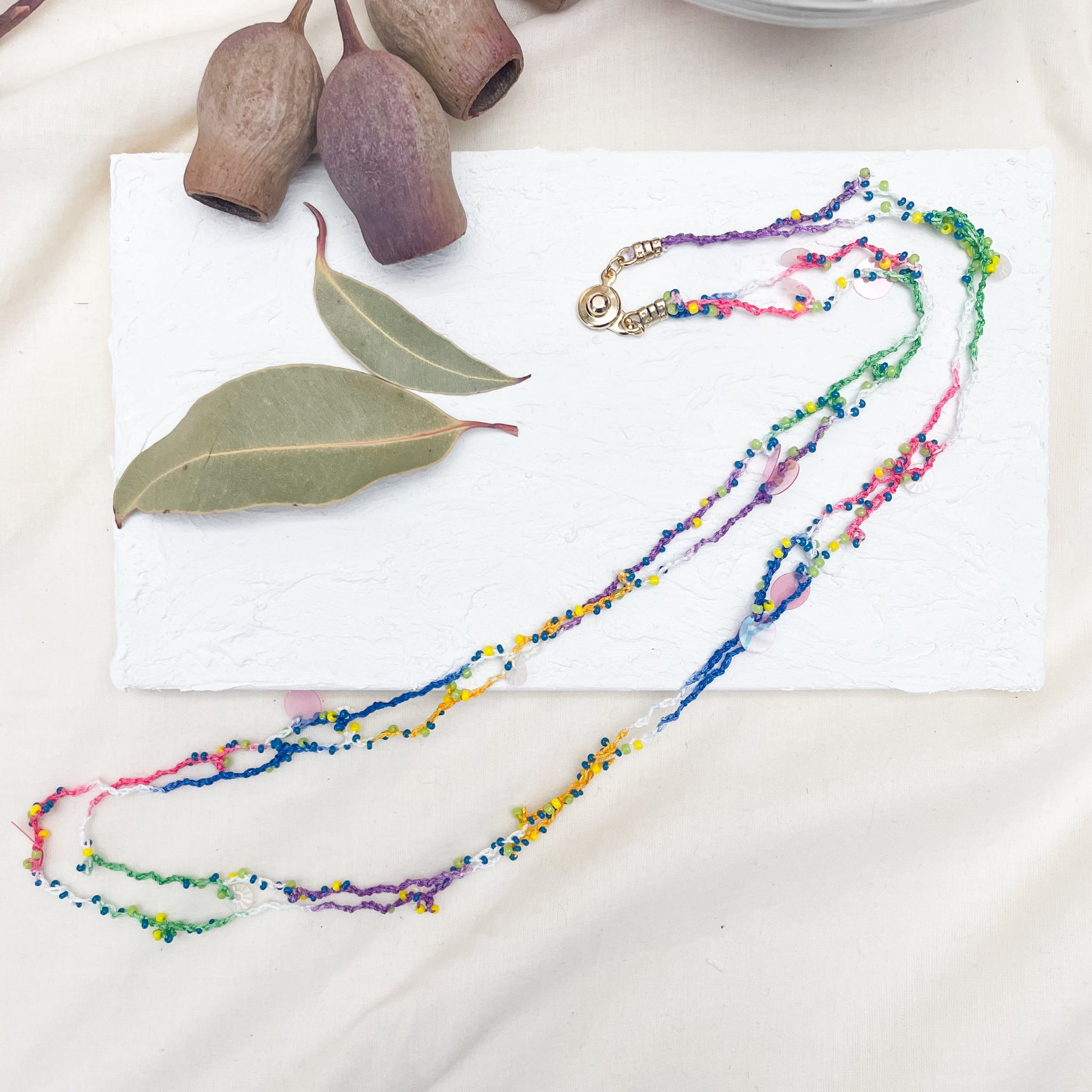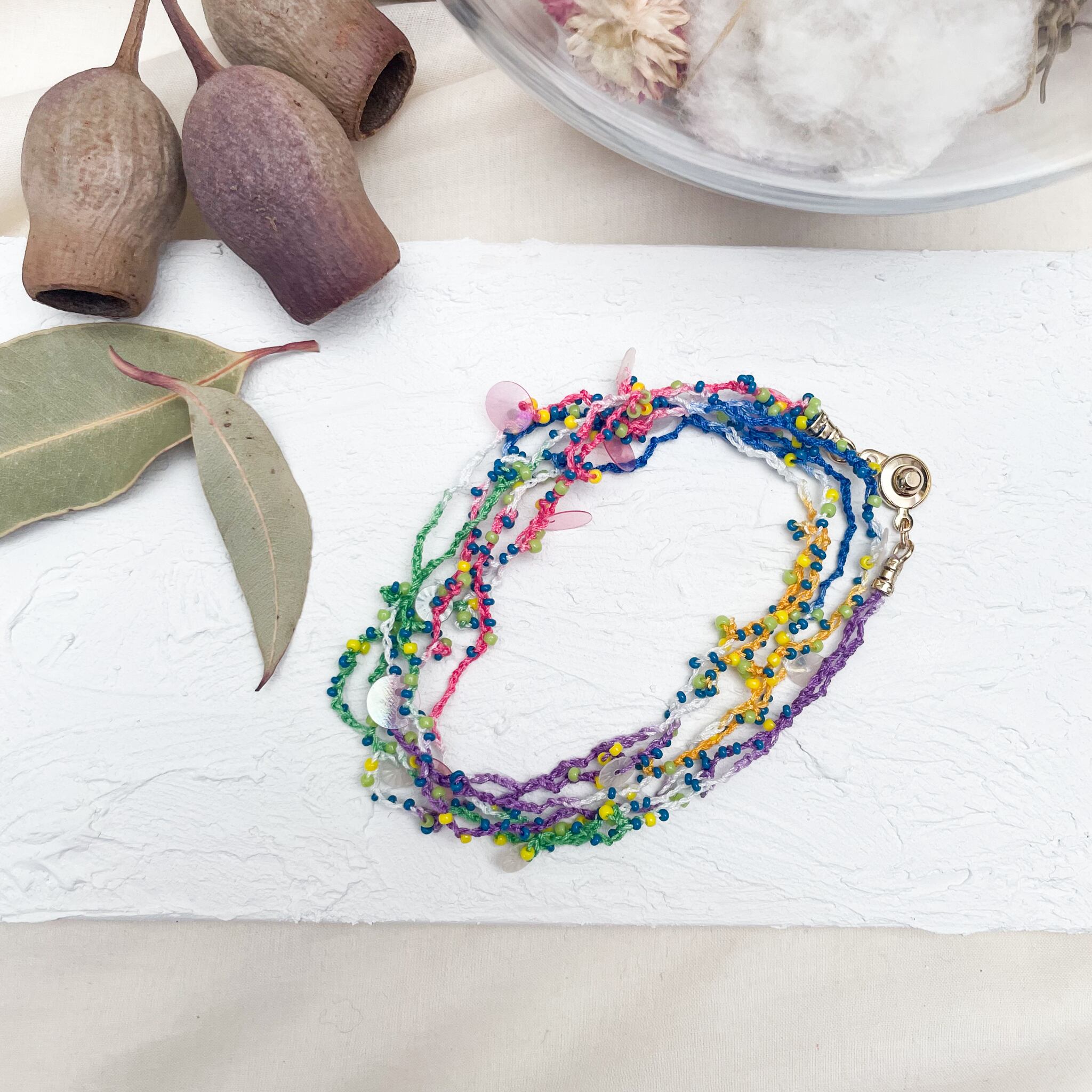 たくさんのイロのレース糸にたくさんのイロのビーズを一粒ずつ丁寧に編み込み仕立てます。