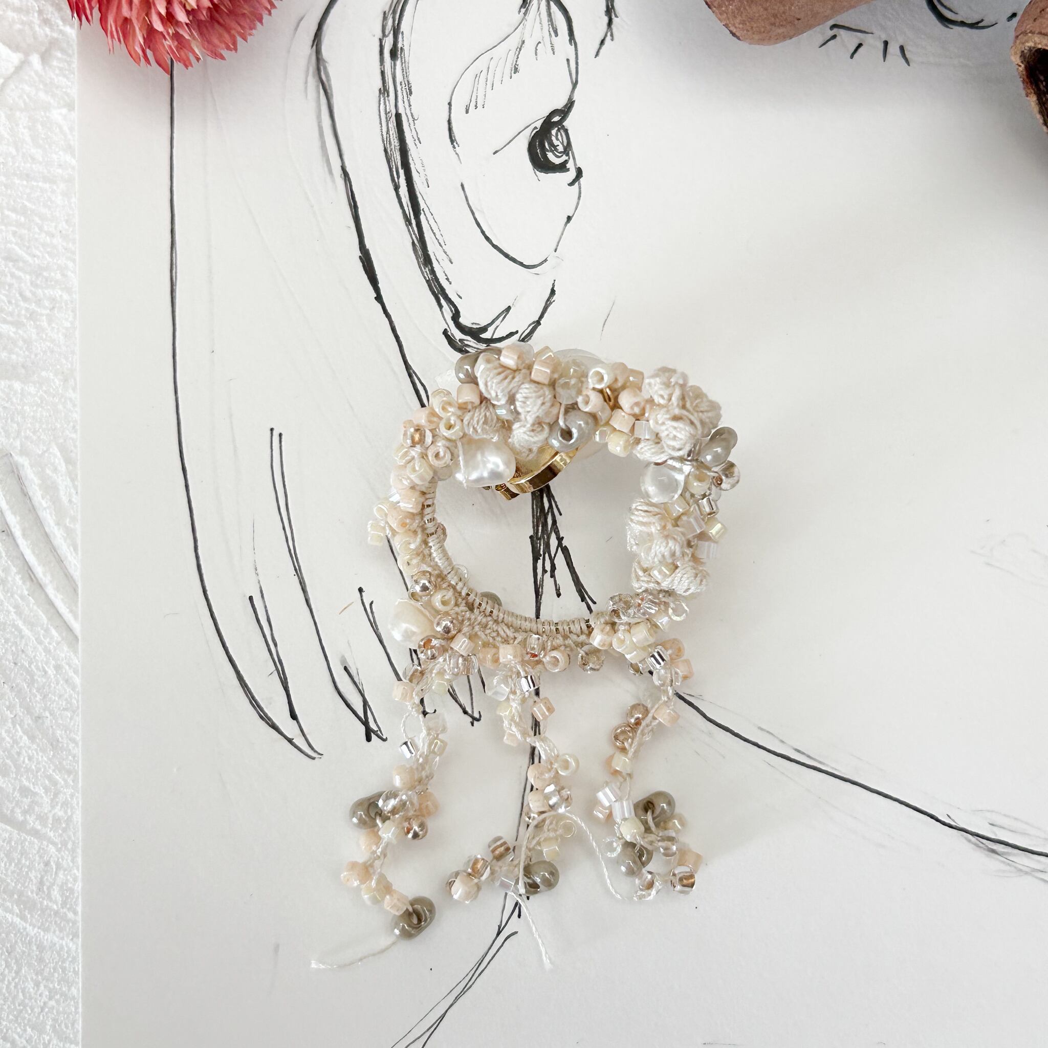生成りの細いレース糸に同系色のビーズやクリアビーズ、アクセントにグレージュを編み込みました。