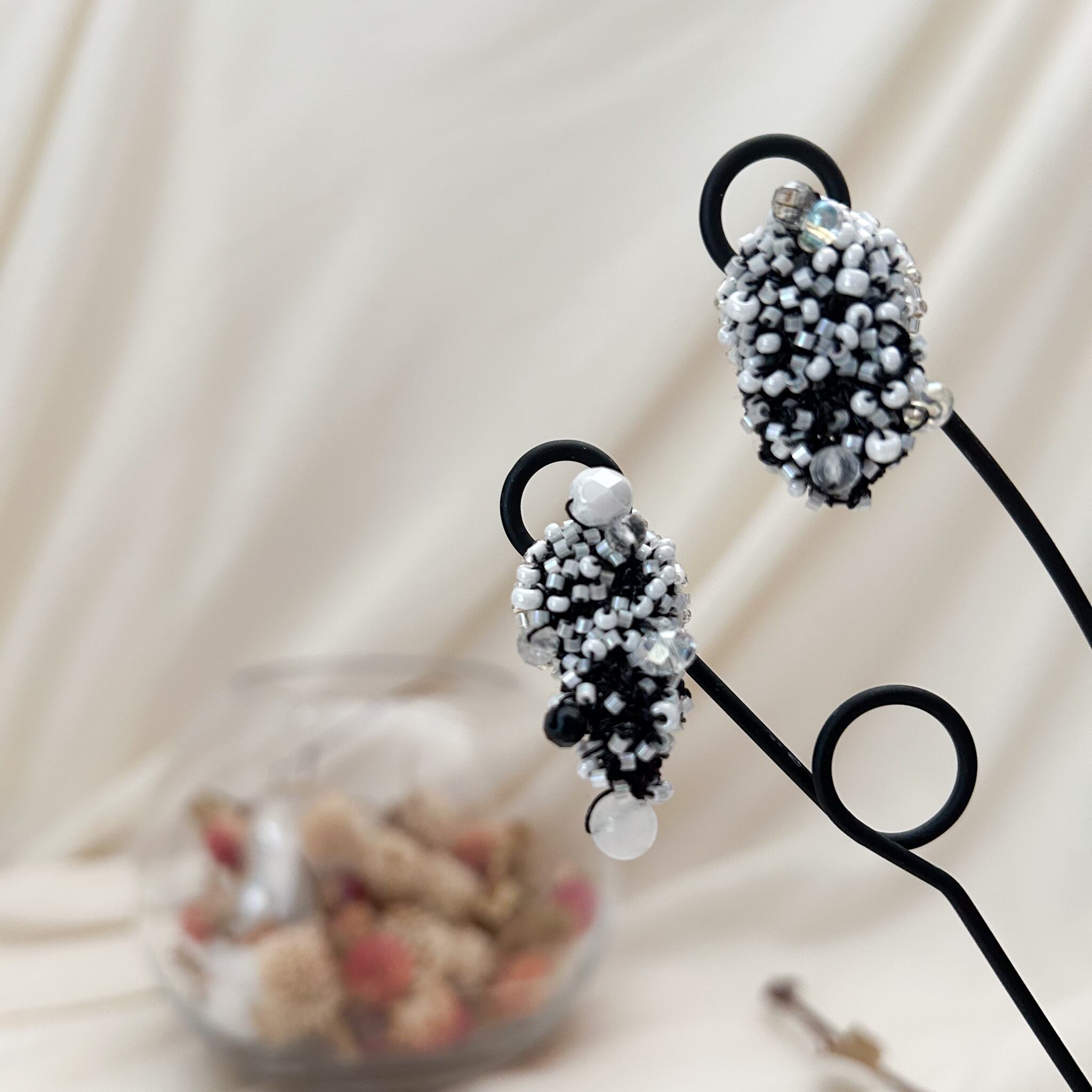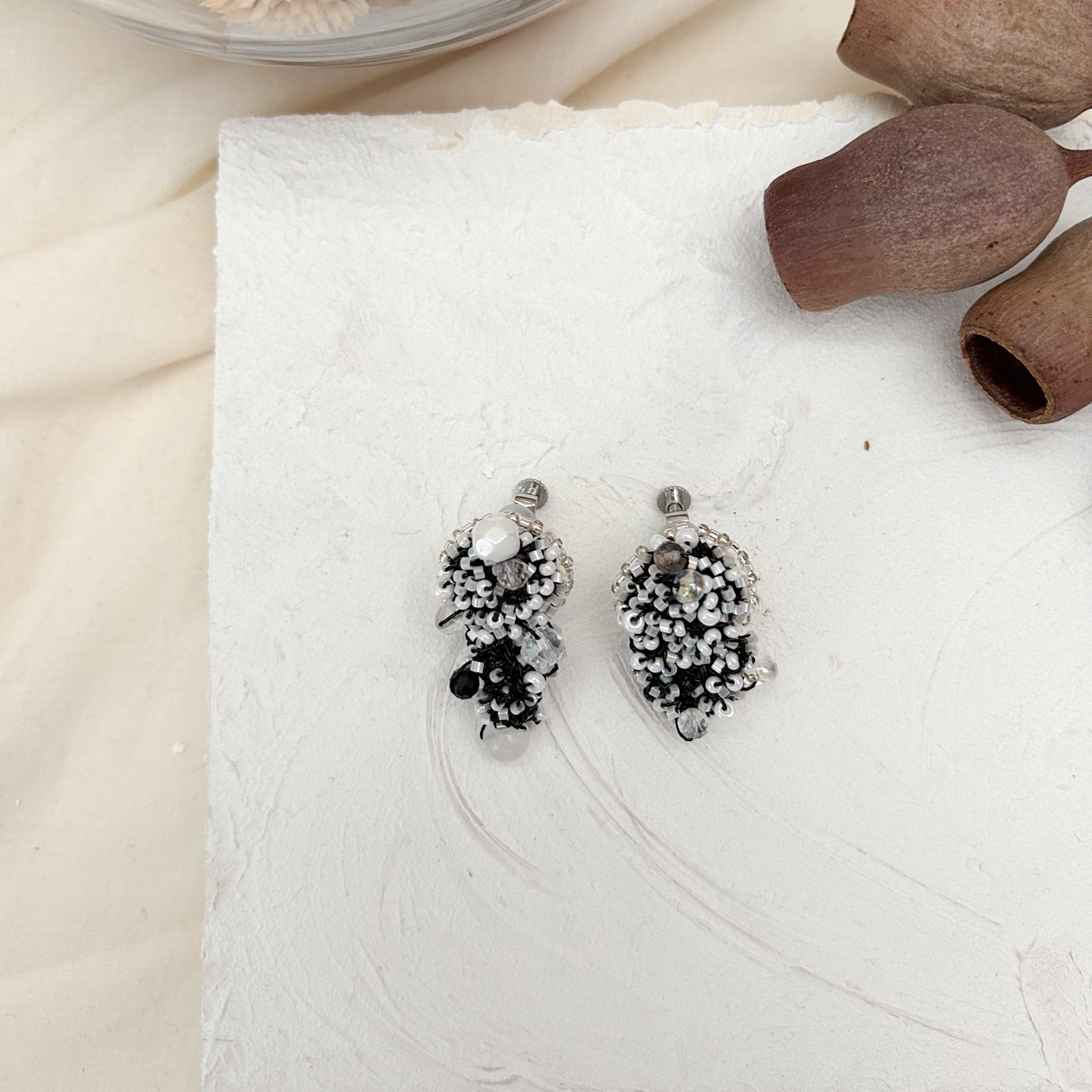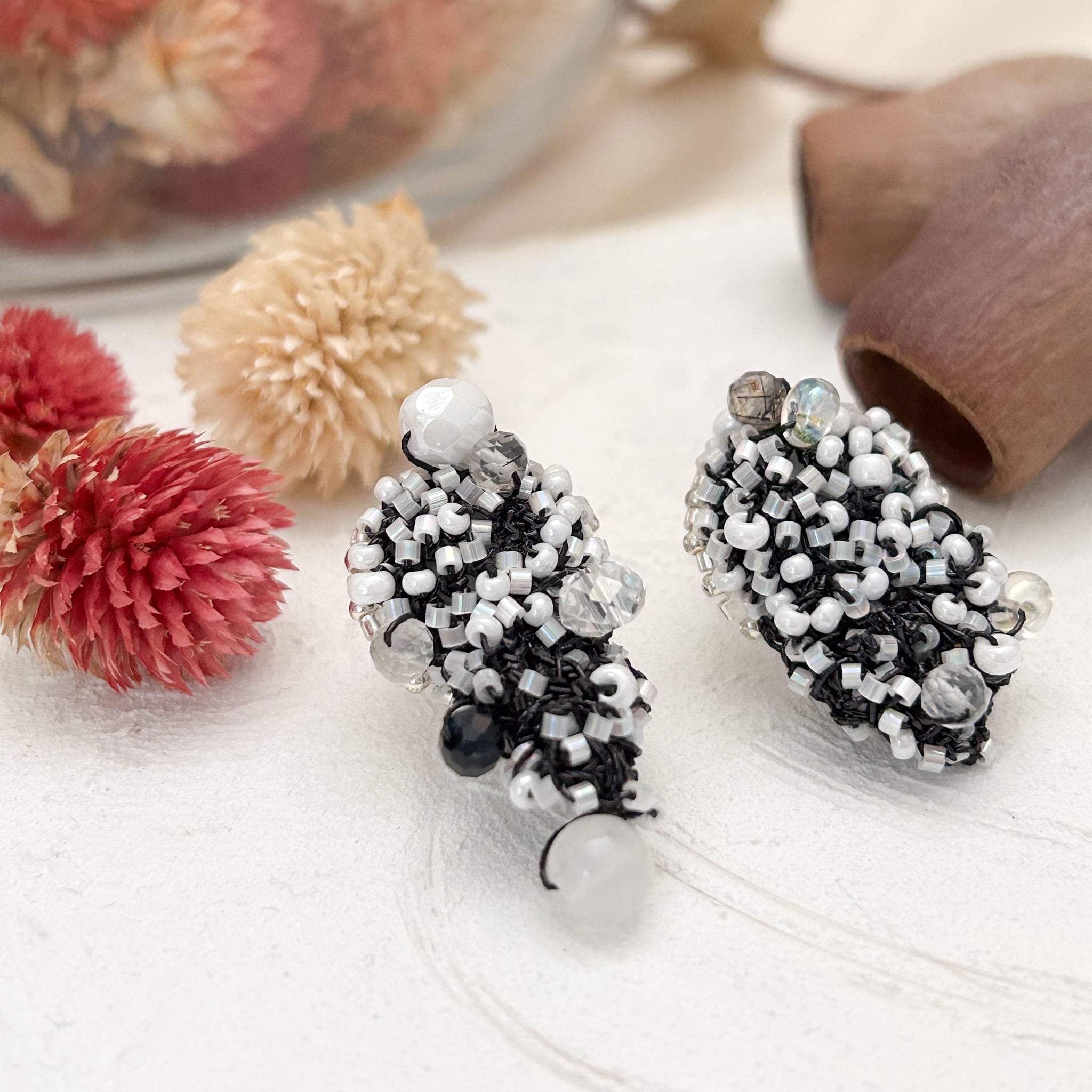 黒のレース糸に白系の極小ビーズやムーンストーン、水晶を一粒ずつ編み込んでいます。