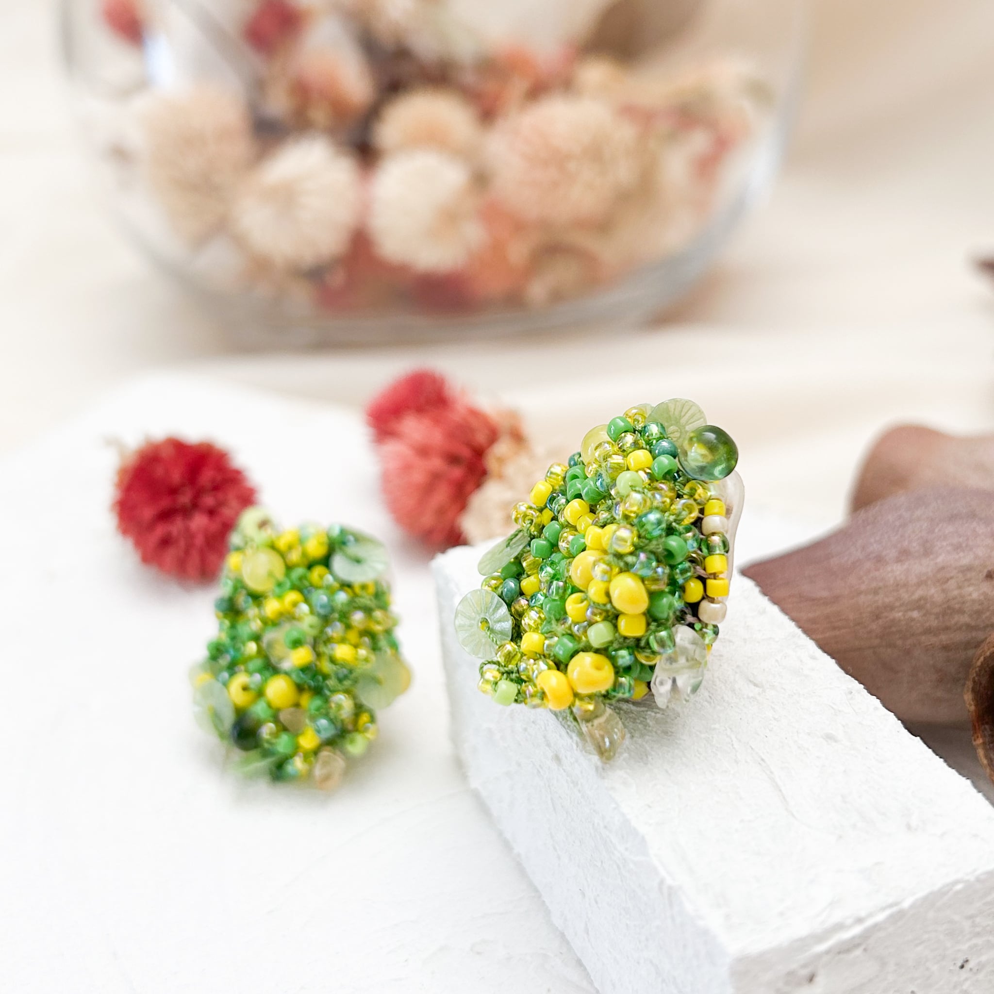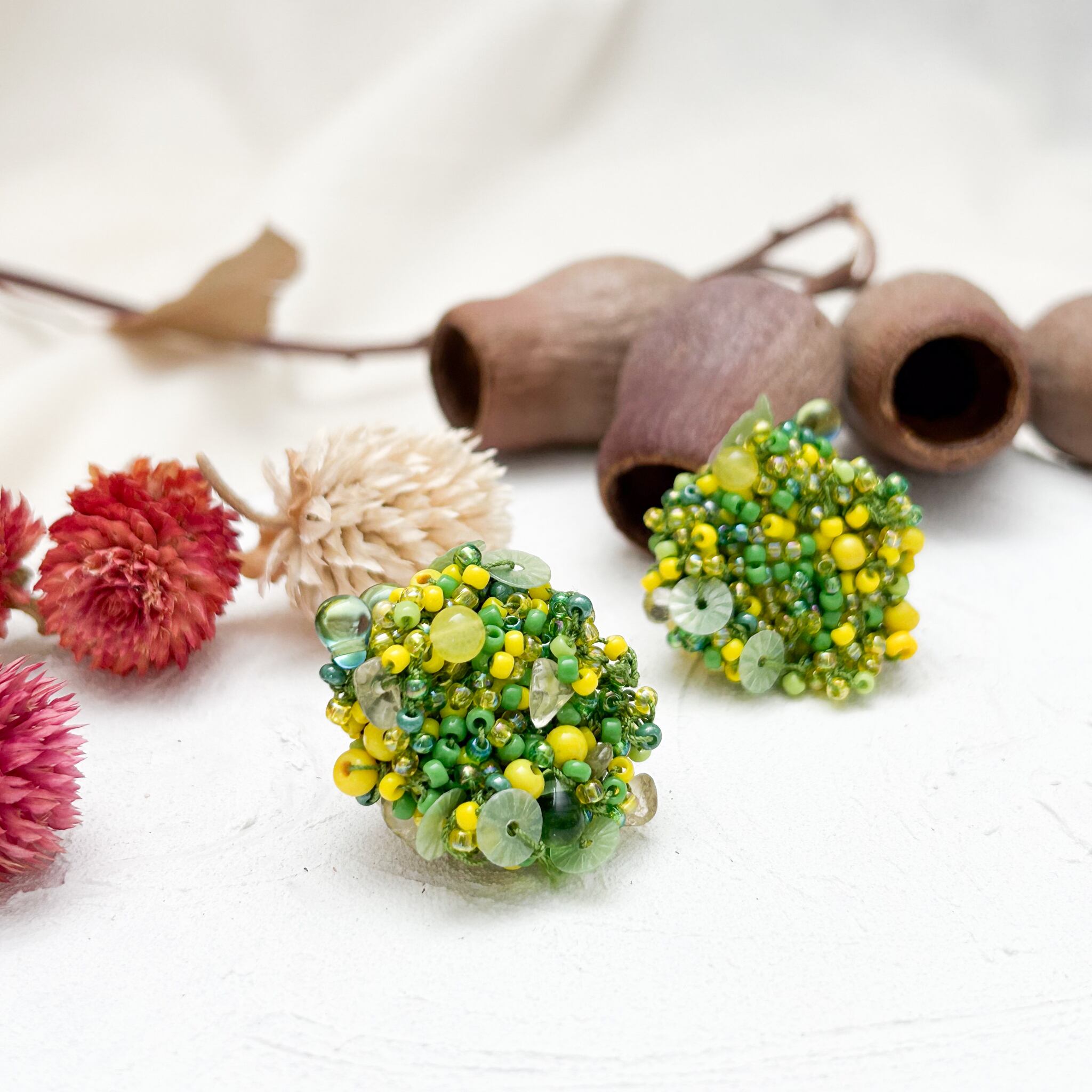 若草色の細いレース糸にマットやクリアのいろんな黄色とグリーンのビーズをギュッと詰め込んだら