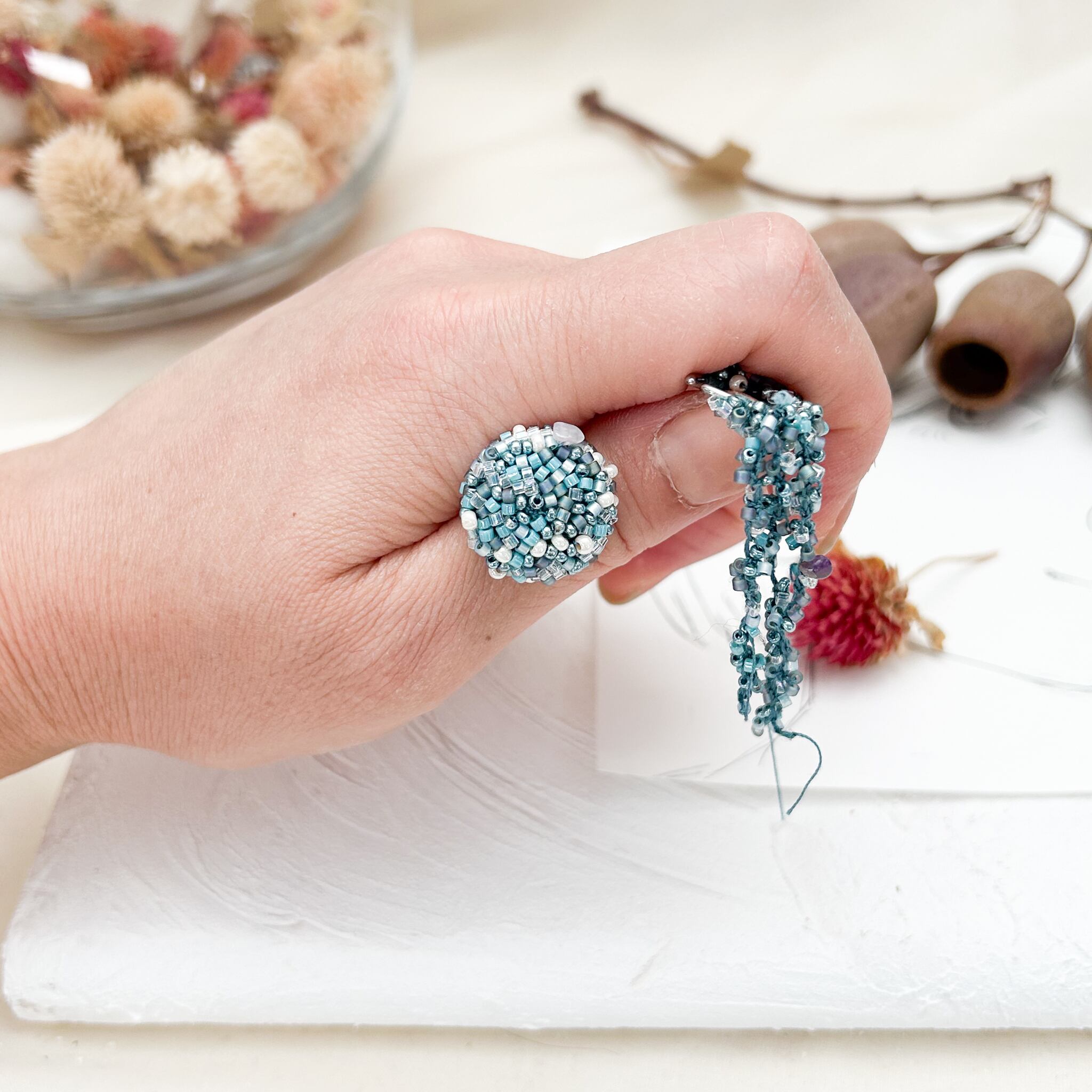 たくさんのイロのレース糸や縫糸にたくさんのイロのビーズを一粒ずつ丁寧に編み込み仕立てます。